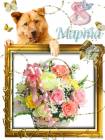 Собака положила лапу на картину с цветами; большая корзина с розовыми, желтыми, белыми цветами, бабочки, поздравительная надпись.